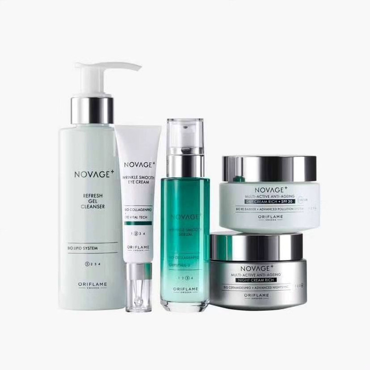 NOVAGE+ Comprehensive antiwrinkle care Wrinkle Smooth (rich texture) این سری پس از اولین استفاده، پوست را به وضوح صاف میکند. تقویت شده با 8 فناوری زیست فعال چین و چروکها را کاهش میدهد و استحکام و آبرسانی را بهبود میبخشد و پوست را جوانتر و درخشانتر میکند. پس از اولین استفاده، پوست را به وضوح تغییر میدهد تنها در چند روز پوست صاف، محکمتر و مرطوبتر میشود طراحی شده برای مبارزه با علائم پیری پوست از نظر بالینی تست شده که استفاده از کل ست 7 برابر موثرتر هست چین و چروکها به وضوح در عرض 2 هفته کاهش مییابد 96% از زنان گزارش میدهند که پوستی نرم، سفت و درخشان فقط در 3 هفته را تجربه کردهاند. Novage+ Wrinkle Smooth یک سیستم درمان ضد پیری حلهای است که برای انواع پوست طراحی شده و با فناوریهای زیست فعال تقویت شده است. این ست شامل پنج محصول میباشد ۱. ژل پاک کننده، که ناخالصیها را از بین میبرد، سد محافظ پوست را حفظ میکند و آن را برای جذب مواد موثر آماده میکند. کد 41029 150 میلی ۲.کرم دور چشم، که به طور موثر اما ملایم عمل میکند و علائم پیری و خستگی را در این ناحیه ظریف از بین میبرد. کد 41034 15 میلی ۳.سرم، که محصول اصلی مراقبت است. فرمول غلیظ آن با مواد فعال برای رفع مشکلات خاص پوست غنی شده است. کد 41035 30 میلی ۴ و ۵.فرمولهای مولتیاکتیو کرمهای روز و شب، پوست را جوان کرده و به حفظ رطوبت در آن کمک می کند. کرم روز با اسپیاف ۳۰ اثر محافظتی دارد و کرم شب اثر احیا کننده دارد. کد کرم روز 41048 50 میلی کد کرم شب 41058 50 میلی برای انواع پوست از جمله پوست حساس کرمهای روز و شب موجود در این مجموعه بافت غلیظتر و غنیتری دارند که برای همه مناسب است، به خصوص برای کسانی که پوست خشک دارند. تست شده از نظر درماتولوژی و متخصصین چشم (کرم دور چشم). بسته بندی محصول حاوی مواد بازیافتی است کد ست 43695 و واتس اپ جهت مشاوره و 09108719394